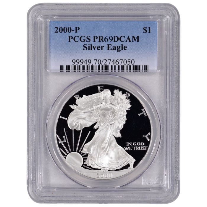 Today, you can find 2000 1 oz American Silver Eagle Proof coins graded and certified as PR-69 coins by PCGS available for purchase at SD Bullion.