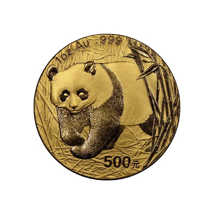 The 2002 reverse design features a detailed depiction of a Panda bear walking through the bamboo grass. The inscriptions that inform the coin’s weight, metal content, and purity are on top and read “1 oz Au .999.” The coin’s face value is on the lower right.