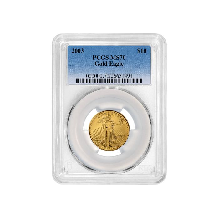 SD Bullion has 2003 1/4 oz American Gold Eagle Coins in stock, sealed by PCGS and certified as perfect MS-70 coins.