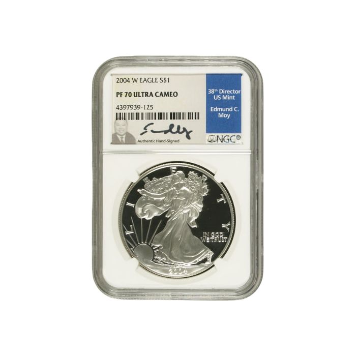 Shop the 2004-W NGC PF-70 1 oz American Silver Eagle Proof Coin with Edmund C. Moy Label online, 24/7, from SD Bullion.