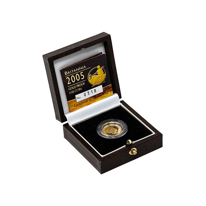 Today, SD Bullion offers 2005 1/10th oz Gold Britannia Proof Coins housed in an Original Royal Mint Box and accompanied by a Certificate of Authenticity.