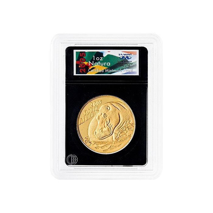Purchase the 2005 1 oz South African Natura Hippopotamus Certified Mintmark Proof Gold Coin online from SD Bullion.