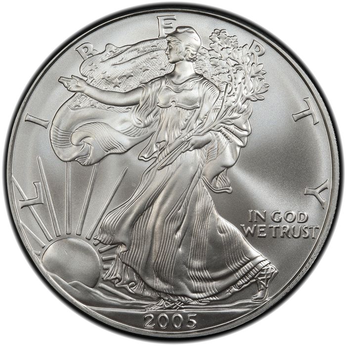The 2005 Silver American Eagle from the US Mint had production totals of 8,891,025 BU coins. The Silver American Eagle is the top selling bullion coin in the United States. The coin is highly recognizable and is well suited for savvy investors, collectors, and those new to coin collecting.