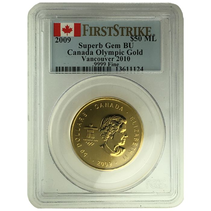 With a mintage of just 49,802 coins, these 2009 1 oz Canadian Thunderbird Gold Coins were struck by the Royal Canadian Mint to commemorate the 2010 Vancouver Winter Olympics and are relatively hard to come by. SD Bullion offers Superb Gem BU specimens of these coins, graded and sealed in a plastic slab by PCGS (Professional Coin Grading Service).