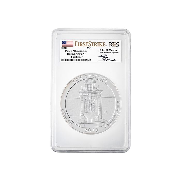 Buy 2010 PCGS MS-69 DMPL First Strikes 5 oz America The Beautiful Hot Springs Silver Coins - John Mercanti Label at SD Bullion