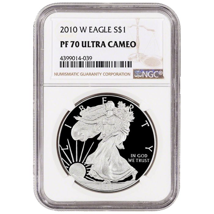 Obtain a perfect PF-70 Ultra Cameo graded 2010-W American Silver Eagle in a sealed plastic slab from NGC, protecting them from external harm. Not only are they an excellent way of completing your collections with perfect specimens of American Silver Eagle Proof coins, they make a very thoughtful gifting item as well.