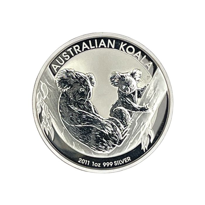 The series name, “AUSTRALIAN KOALA,” arches over the image, while the coin’s mintage, weight, purity, and metal content are on the bottom: “2011 1 oz 999 SILVER.”