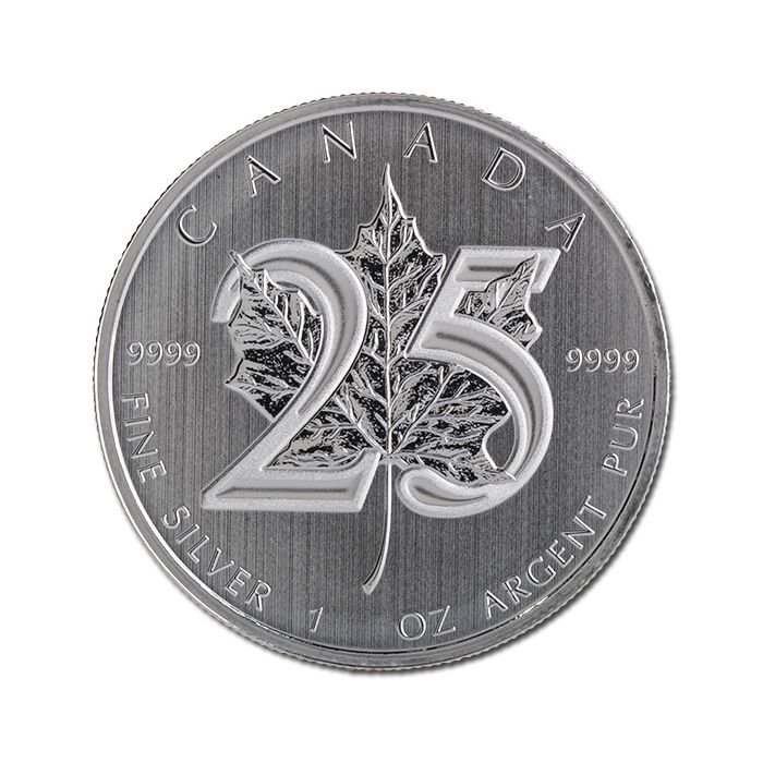 This special edition Silver Maple Leaf coin features the traditional maple leaf design along with a “25″ mark to celebrate the 25th Anniversary of the series.