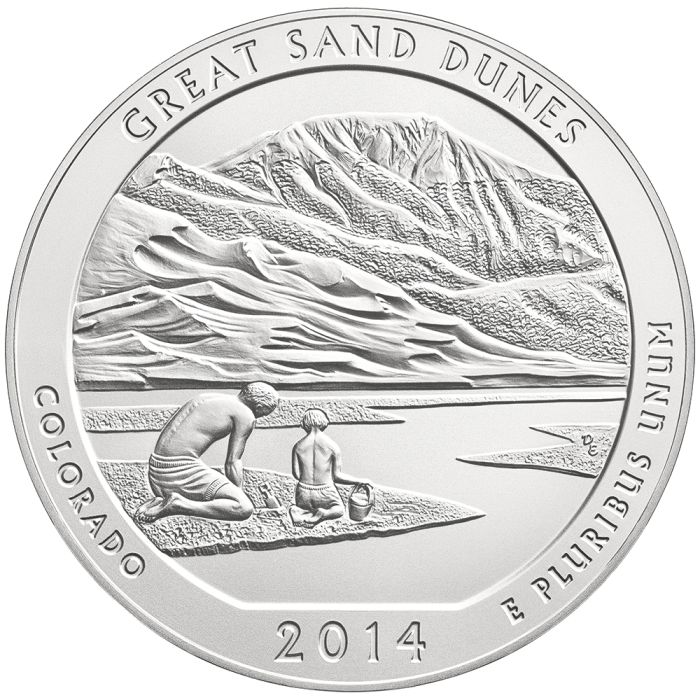 The Great Sand Dunes National Park quarter is the fourth of 2014 and the 24th overall in the America the Beautiful Quarters® Program. Great Sand Dunes National Park and Preserve has the tallest dunes in North America as the centerpiece of the site’s diverse landscape of grasslands, wetlands, conifer and aspen forests, alpine lakes, and tundra. These can be experienced through hiking, sand sledding, splashing in Medano Creek and watching wildlife.
