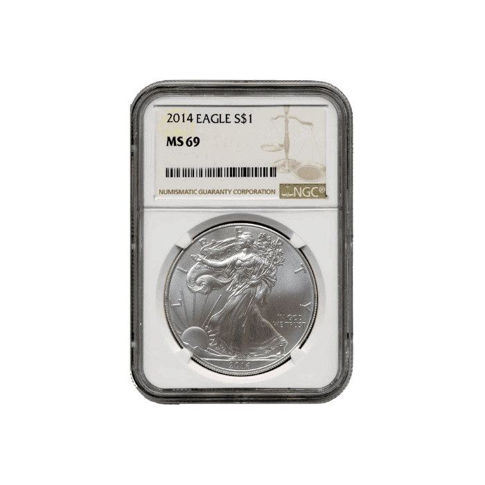 Buy 2014 NGC MS-69 American Silver Eagle CoinsTotal Graded Population Of 298,027!These 2014 American Silver Eagles minted by at the United States Mint have been graded by one of the most prestigious coin-grading agencies in the world – NGC (Numismatic Guaranty Corporation). Moreover, NGC encases these coins after grading them, ensuring their condition remains intact. Each of these coins is graded a near-perfect MS-69, indicating coin specimens that do not display any visible imperfections whatsoever.NGC was established in 1987 with the sole aim of providing more information to the buyer before they spend their hard-earned money on unknown quality. Moreover, their Sheldon Scale of grading has proven effective in denoting the condition/quality of any given coin. With a long history of providing reliable grades to coins, the precious metals market now places significant value on NGC grades. Interestingly, NGC is now the largest third-party coin-grading agency in the world by volume.Each of these 2014 American Silver Eagles contains 1 troy ounce of 0.999 pure silver. Moreover, the United States Government guarantees a nominal face value of $1 for every one of these coins. The coin’s reverse features the famed Walking Liberty portrayal by Adolph A. Weinman. It was created in 1916 for the half-dollar coin, which was later known as the Walking Liberty Half Dollar due to the beauty and elegance of Weinman’s handiwork.Considering the pure silver content of the coin and the near-perfect MS-69 grade assigned to these 2014 American Silver Eagles, they will go a long way in completing American Silver Eagle collections. Moreover, the elegant imagery on both sides of the coin makes them a great gifting item for those who appreciate beautiful designs on pure silver. These coins may display some natural spotting, which is completely normal and can occur over time and does not affect the grade of the coin. They all have been professionally graded by their respective certifier. The protective plastic slab the coin comes in certifies its grade. These slabs are subject to light abrasion marks, chips, cracks, and scuffs. These marks do not at all hinder the grade of the coin assigned to it and they do not devalue the slabbed coin in any way.
