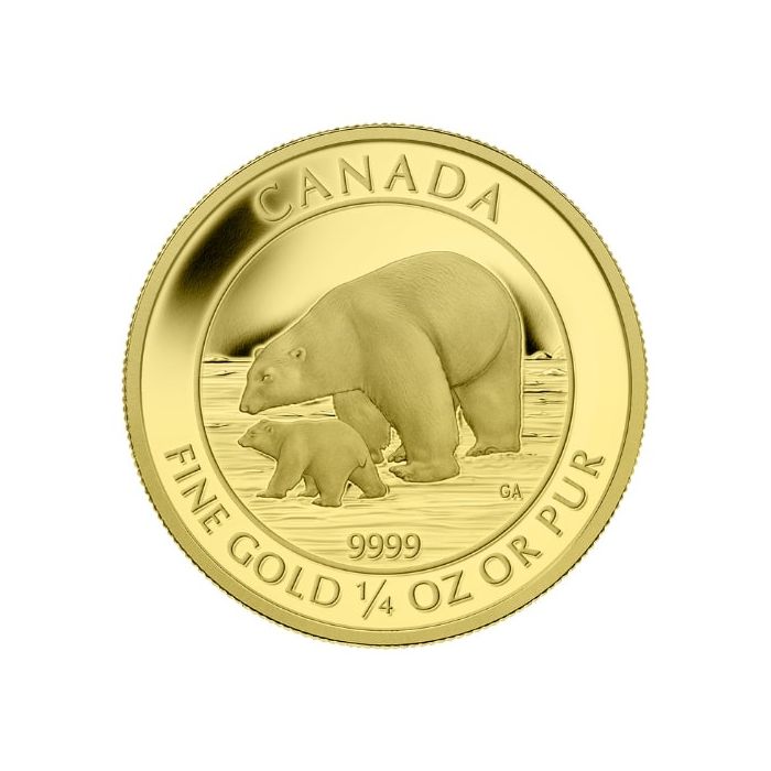 The reverse, a stunning creation by artist Germaine Arnaktauyok, captures the Polar bear with its cub in their natural habitat. The image is adorned with the engravings “CANADA,” “9999,” and “FINE GOLD ¼ OZ OR PUR,” which refer to the coin’s origin, purity, metal content, and weight.
