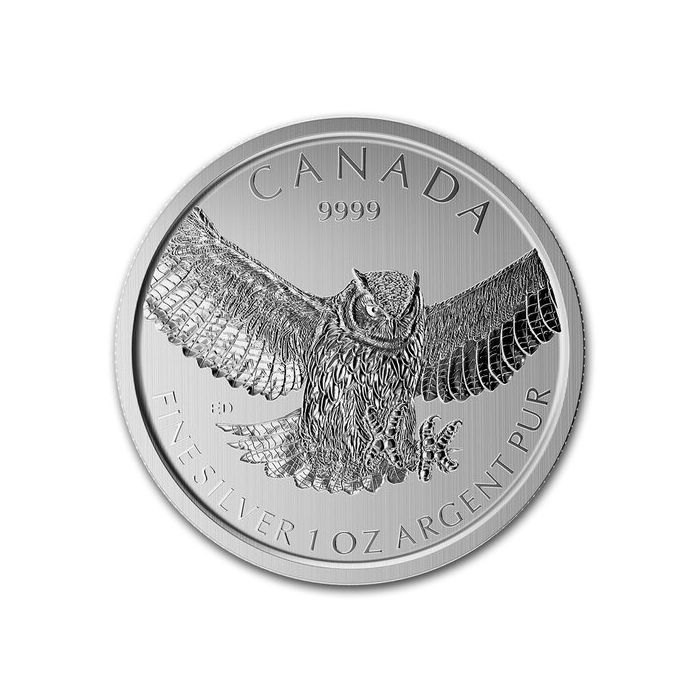 The $5 Canadian Great Horned Owl is the last of 4 releases in the limited edition Birds of Prey series from the Royal Canadian Mint, depicting the spectacular Canadian Great Horned Owl.