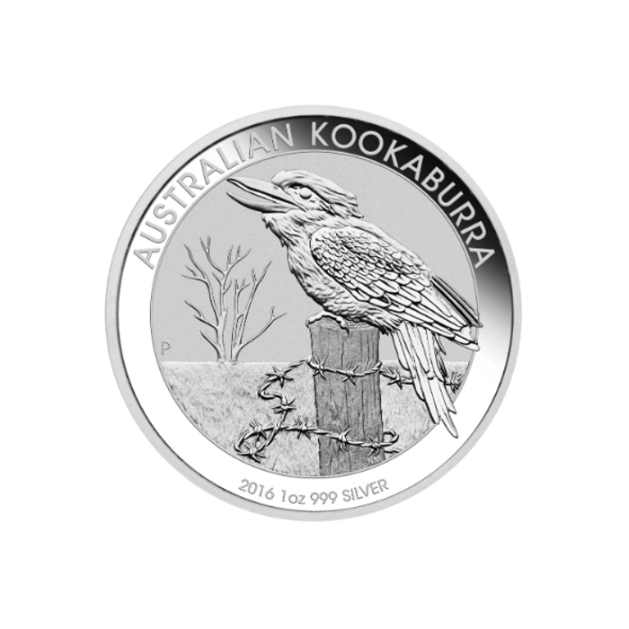 Buy 2016 Australian Perth Mint Kookaburra Online at the Lowest Price Guaranteed From the Most Trusted Gold and Silver Bullion Dealer in the US | .999 Fine Silver2016 Perth Mint Silver Kookaburra 1 oz .999 fine silver!The reverse of the 2016 'Kook' features a kookaburra perched on top of a fence post wrapped in barbed wire in the Australian outback. It has the Perth Mint's 'P' mintmark on the left hand side.One of the most famous and popular collectible coins in the world, the 2016 1 oz Silver Kookaburra has an Extremely Limited Mintage of just 500,000!Each 1 oz Kookaburra coin ships in its original protective capsule from the Perth Mint, and is FRESH FROM THE MINT in BU condition!1 troy oz .999 fine silverOrders in multiples of 20 coins ship in mint sleeveOrders in multiples of 100 coins ship in mint boxAustralian Legal Tender Mintage: 500,000