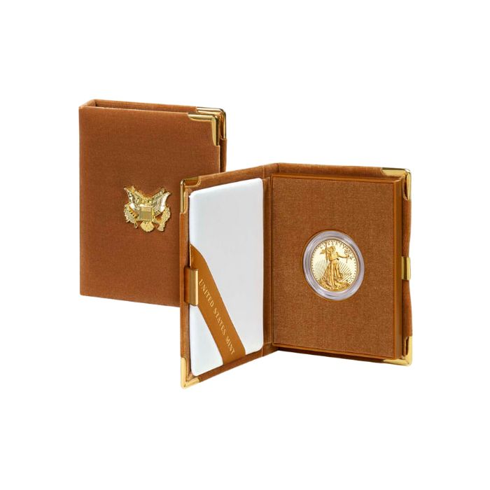 Proof 1/2 oz Gold Eagles are legal tender through a USD 25 face value and reproduce a standard patriotic design like their counterparts. However, due to their proof finish, their design is enhanced by a mirror-like luster.