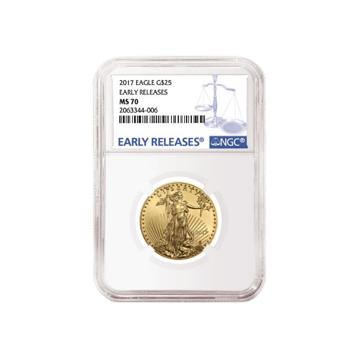 Containing a half troy ounce of pure 0.9167 or 22-karat gold, NGC experts have graded and certified these American Gold Eagle coins. Assigned a grade of MS-70, the highest possible grade that can be awarded to a coin, this gold coin specimen will bear no imperfections whatsoever. Moreover, it has been minted within the first 30 days of the release of the 2017 American Gold Eagles, as verified by its ‘Early Releases’ label.