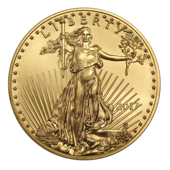 The American Eagle coin can be purchased in both gold and silver, but the designs are very different. For the 2017 Gold American Eagle Coin, the US Mint chose to use an adaptation of the Saint-Gaudens Walking Liberty design, which features Lady Liberty carrying a torch and olive branch with the shining sun behind her. The word Liberty appears at the top of the obverse, with the mint date found on the lower right side.