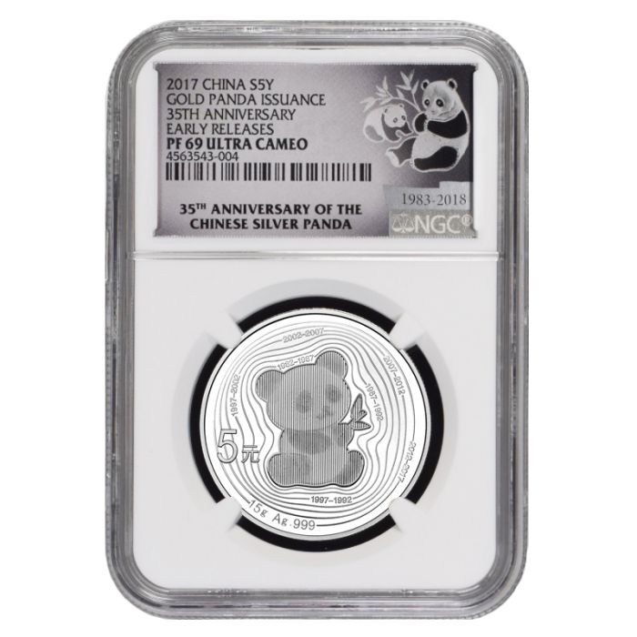 Each of these 35th anniversary 2017 Chinese Silver Panda Proofs contain 15 grams of 0.999 fine silver. Moreover, they are assigned legal tender status in China with a face value of 5 Yuan.