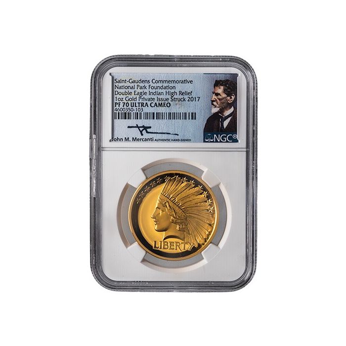 Today, you can acquire the 2017 1 oz Gold Indian Double Eagle High Relief Proof from the Saint-Gaudens Collection. It is certified as a PF-70 sample and sealed in an NGC John Mercanti hand-signed label.