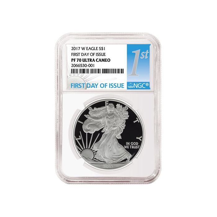 Showcasing an elegant label from NGC that certifies this proof coin’s mintage on the very first day of the release of the US Mint's 2017 American Silver Eagles, it is part of a select group of coins that were awarded a perfect PF-70 Ultra Cameo grade.