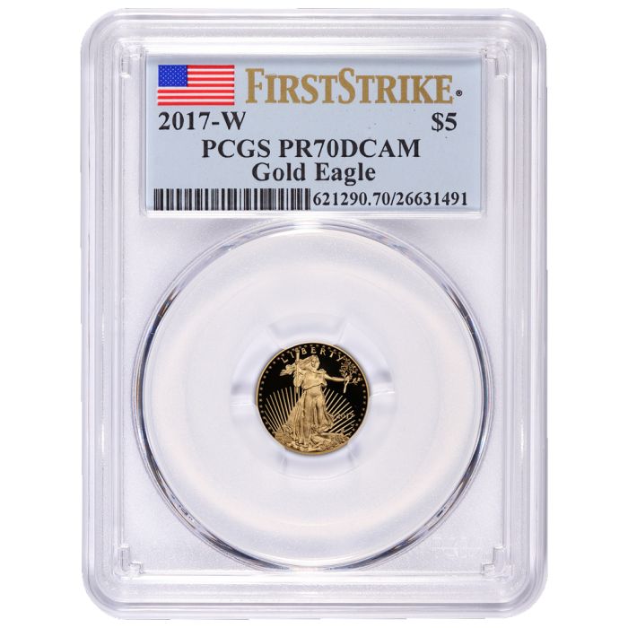 PCGS, or the Professional Coin Grading Service, was founded in 1985, with the sole aim of providing reliable standards for precious metals coins. Each of these 2017 American Gold Eagle Proof coins contains 1/10 ounce of 0.9167 pure gold (also called 22-karat gold). Moreover, they also bear a nominal face value of $5, assigned by the United States Government.
