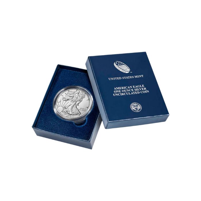 Each American Silver Eagle coin is minted with precision, combining aesthetic beauty and guaranteed metal content. It contains 1 Troy oz of 99.9% fine silver in bullion, proof, and burnished versions.