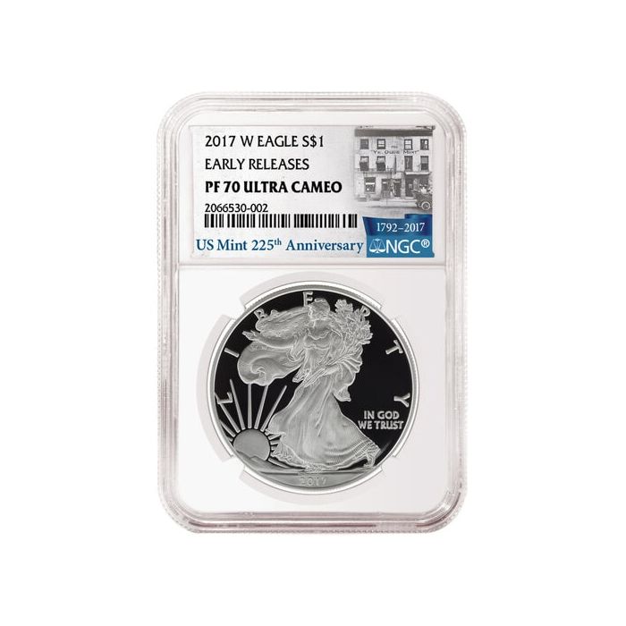 Bearing a unique label commemorating the 225th anniversary of the United States Mint from NGC, these 2017 American Silver Eagle Proof coins are in pristine condition, certified by the PF-70 Ultra Cameo grade assigned to them. While PF-70 grades denote coins with no detectable surface imperfections, even under magnification, the Ultra Cameo designation indicates an excellent contrast between the mirror-finish of the silver surface and the frost-finish of the raised design.