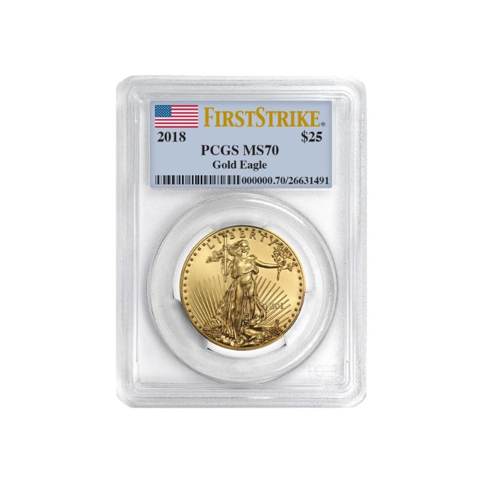 2018 1/2 Ounce Gold American Eagle Coin PCGS MS-70 First Strike For SaleGraded American Gold Eagles are available soon after the annual releases from almost all prominent coin programs. And just in time, the graded variety of coins from this year's American Gold Eagles, the 2018 ½ oz PCGS MS-70 First Strike Gold American Eagles are now available at SD Bullion. An MS-70 grade is awarded to coins that are truly unblemished and perfect, in finish, design, and make. This is the highest grade that can be assigned to a coin on the Sheldon Scale (1-70), which is the industry standard in coin grading. These coins are encased in a secure plastic slab with a prominent PCGS label inside. This white label bears the American Flag and the words ‘First Strike’ sprawled across the top. This special ‘First Strike’ designation is reserved for coins that the PCGS receives within a month of launch – guaranteeing you the earliest American Gold Eagle specimens available. Each of these coins contains ½ troy ounces of 0.9167 pure (22-karat) gold. Moreover, like all other American Gold Eagles issued by the US Mint, they are considered legal tender in the USA with a face value of $25 (USD). Not only are these 2018 ½ oz PCGS MS-70 First Strike Gold American Eagles in absolutely perfect condition, they are also among the earliest releases from this year. Snag this piece of US-made perfection from the US Mint to add to your coin collection or diversify your precious metals portfolio.