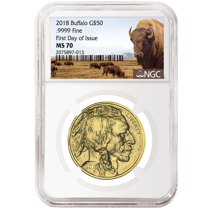 Gold Coins issued on the very first day of launch have always enjoyed a premier standing in the precious metals market. When the coins in question are none other than graded specimens of the famed American Gold Buffalo Coins, their popularity knows no bounds. NGC has inspected these particular 2018 1 oz NGC MS-70 First Day of Issue Gold American Buffalo Coins before grading them and sealing them into secure plastic slabs with an attractive buffalo label.