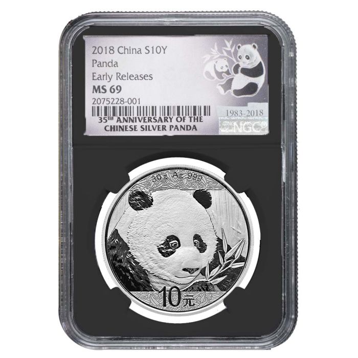 Buy 2018 Chinese Silver Panda Coins OnlineCelebrate the 35 th anniversary of the Chinese Silver Pandas with a graded 2018 30g NGC MS-69 Chinese Silver Panda Coin. Featuring a near-perfect grade from one of the most renowned grading agencies in the world, the coin comes encapsulated in a protective holder with a unique black core – honoring 35 successful years of the Silver Panda series.The whitish-gray label accompanying this coin contrasts elegantly with the special black core holder – making this coin holder very display-worthy indeed. A panda cub and its parent are depicted on this label. Interestingly, this image is borrowed from the 1983 Chinese Silver Panda Proofs – the very first releases under this coin series – throwing a touch of nostalgia and history into the mix.The annually changing designs have kept investors and collectors curious all these years, and every year’s release is met with enthusiasm across the world. These particular coins are graded MS-69 and hold the NGC ‘Early Releases’ designation. While the MS-69 grade indicates that these coins are in near perfect condition (flawless to the naked eye), the ‘Early Releases’ designation assures buyers that they were struck within the first 30 days of minting in 2018.Every coin contains 30 grams of 0.999 pure silver and carries a face value of 10 Yuan.Grab the 2018 30g NGC MS-69 Chinese Silver Panda Coin with the special black-core 35th anniversary holder and label. Complete your coin sets with an NGC-graded coin specimen that strikes a balance between perfection and price.