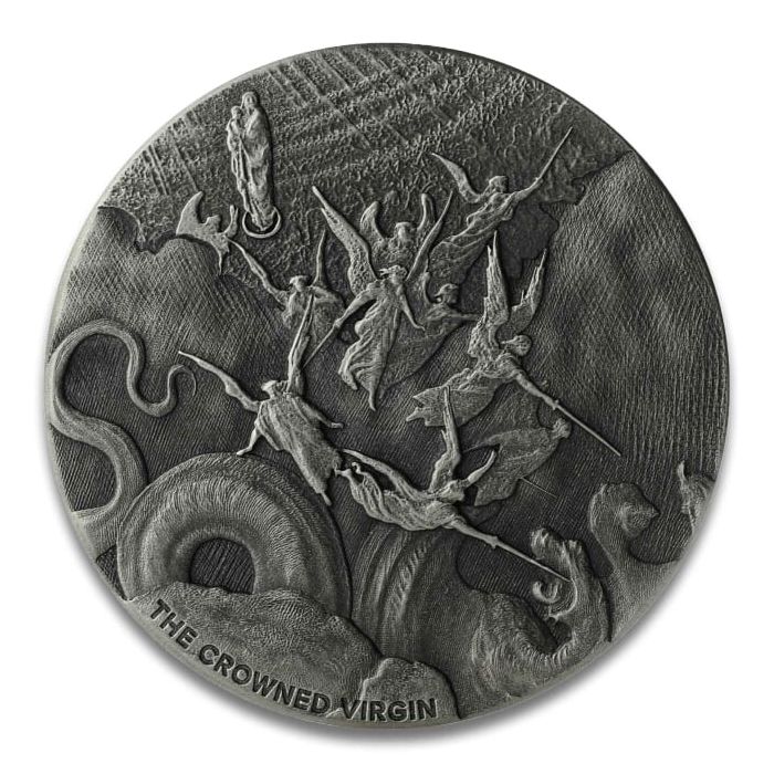 The reverse side of the coin showcases Gustave Doré’s original artwork of an army of angels defeating a black dragon with swords to protect The Crowned Virgin. The artwork on this coin is intense, detailed and masterfully done by the Scottsdale Mint.