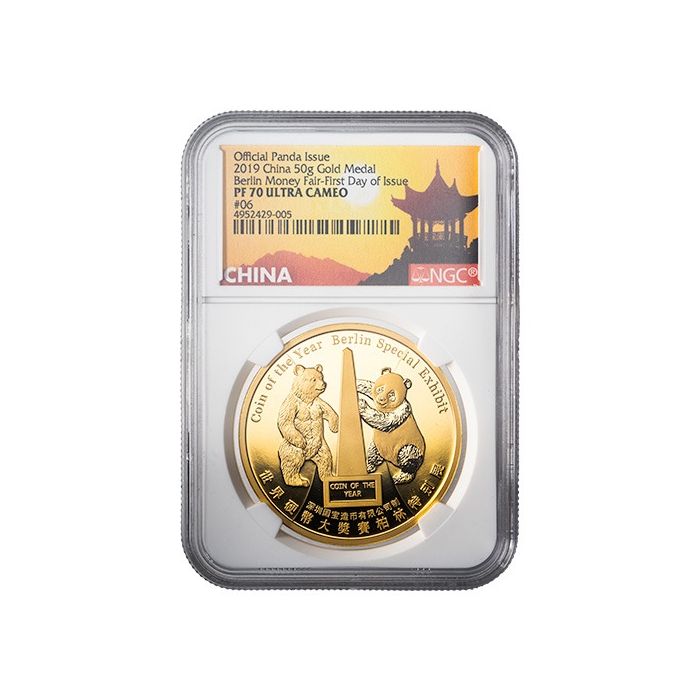 2019 NGC PF-70 First Day of Issue 50 Gram Chinese Panda Berlin Money Fair Gold Medal