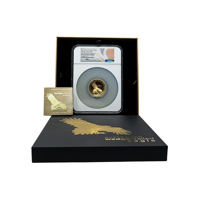 You can acquire 2019 5 oz Australian Wedge-Tailed Eagle Proof Gold Coins housed in an original mint box with a Certificate of Authenticity, sealed and certified by NGC as PF-70 coins at SD Bullion.