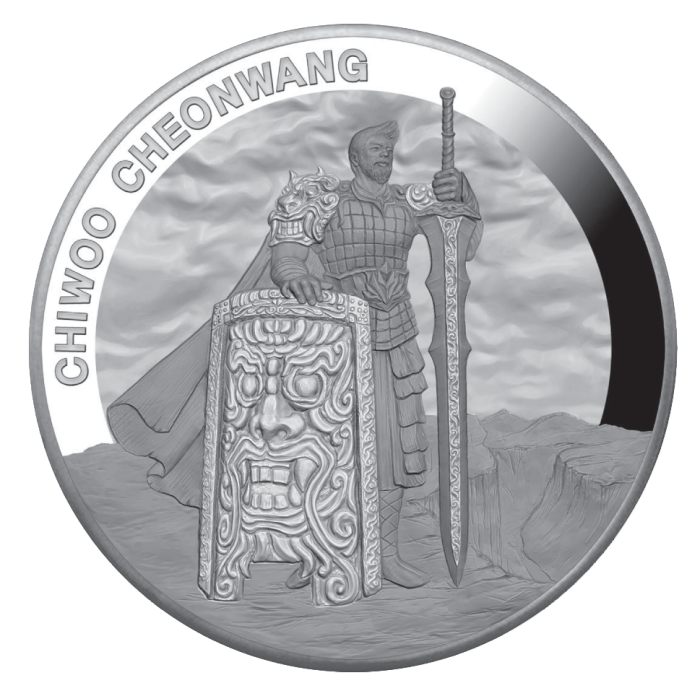 The reverse of this South Korean Proof Coin features a man in full armor wielding a very large sword and holding the shield that is featured on the obverse. The words “CHIWOO CHEONWANG” are minted to the man’s left along with scenic cliff sides in the background.
