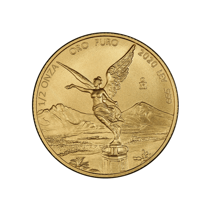 When mintage resumed in 2000, the Gold Libertad highlighted another design on the coin. This design has remained from that point forward and is depicted on the 2020 coin. The reverse side features a “Winged Victory” Angel towering above the volcanoes, Popocatépetl and Iztaccíhuatl, in the background. The words “½ ONZA (ounce), ORO PURO (pure gold), and the year of issue are all inscribed above the angel. The Mexican mintmark can be found under the Angel’s left-wing. Lastly, this face features the word “Ley” (pure) “.999”, indicative of the coin’s purity.