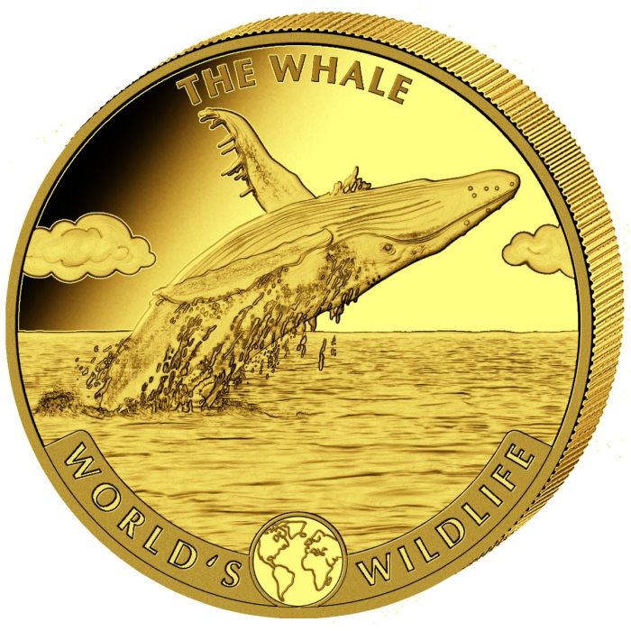 The obverse of these gold coins features a Whale breaching the ocean's surface, arcing its back and striking an iconic pose as water cascades off of it. The words “THE Whale” are minted at the top with “WORLD’S WILDLIFE” at the bottom with an outline of an atlas in between the words.