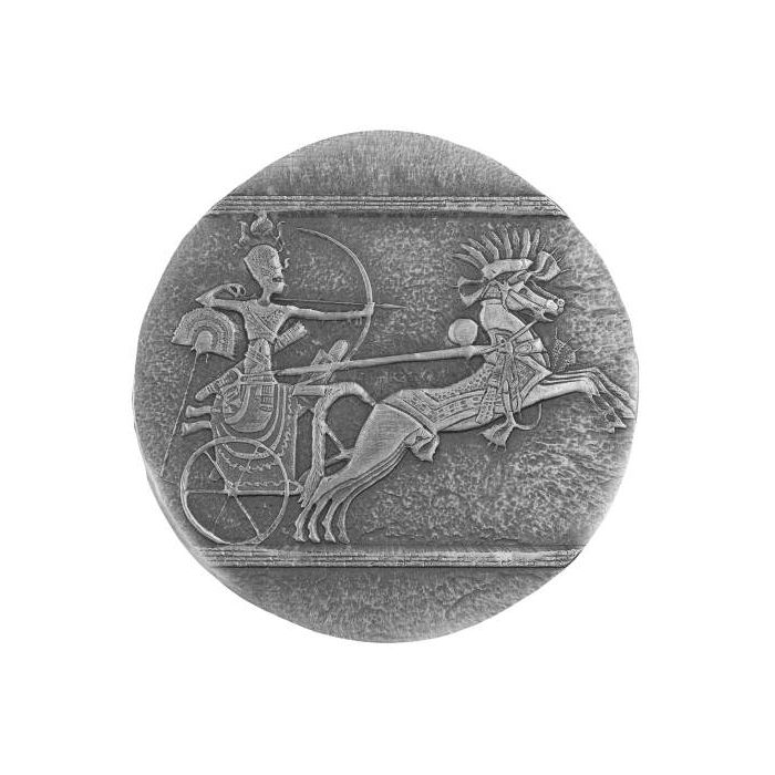 The reverse features an ancient Egyptian warrior riding in his chariot with a horse pulling him. The warrior is headed to war with his bow and arrow strung. The unique depiction is displayed in a Hieroglyphic manner. The obverse features Chad’s national coat of arms surrounded by the issuing country, weight, denomination, year of issue, and purity of the coin.