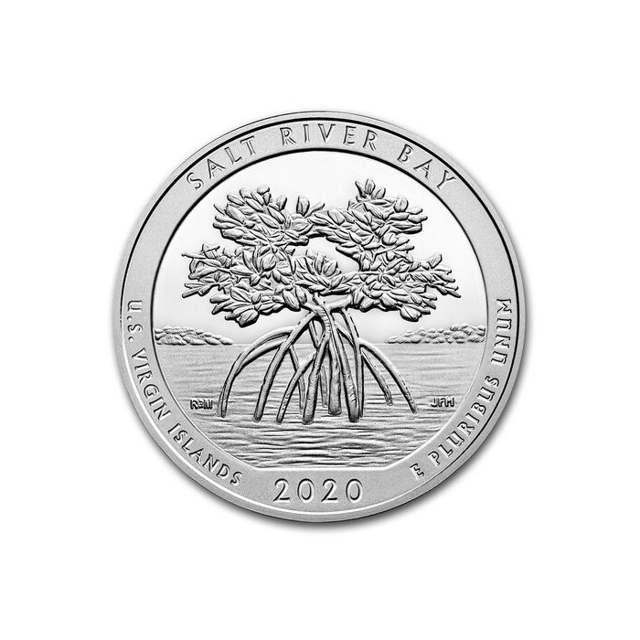 The reverse features a young red mangrove tree growing into the large tree it will end up as. The mangrove tree is featured in the design to bring awareness to the fact that the trees are endangered and to depict their fragile and delicate nature of the tree which is able to reproduce in saltwater. Around the central design are the words, “SALT RIVER BAY”, “U.S. VIRGIN ISLANDS”, “2020”, & “E PLURIBUS UNUM”.