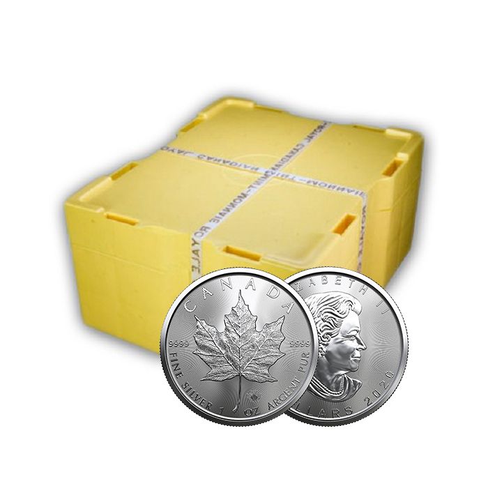 This Monster Box of 500 one-ounce Canadian Silver Maple Leaf coins is a convenient method of investing a substantial sum of money into the silver bullion market. The 1 oz Canadian silver maple leaf coin is manufactured from the finest .9999 purity level of silver and carries a face value of 5 Dollars (CAD).