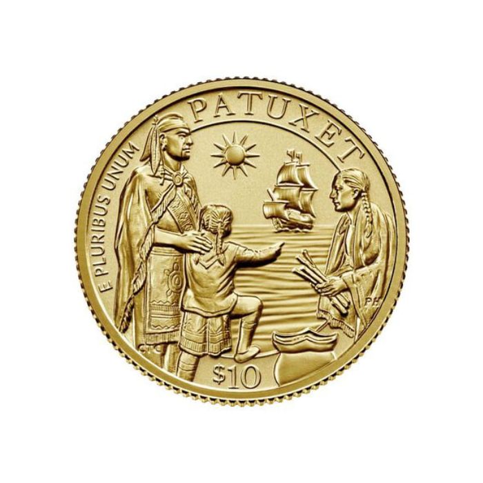 The engravings on this side correspond to the coin’s face value at the bottom, “$10”, the motto “E PLURIBUS UNUM,” and “PATUXET,” the native Wampanoag word for the Plymouth coast.