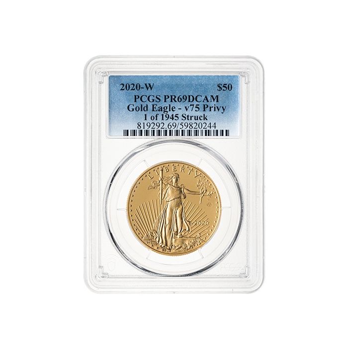 SD Bullion offers 2020-W 1 oz American Gold Eagle Proof coins imprinted with the V75 Privy Mark, graded as PR-69 by PCGS.