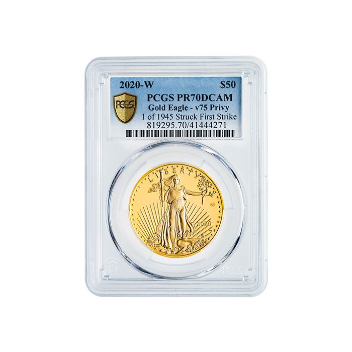 Today, SD Bullion offers 2020-W 1 oz American Gold Eagle coins imprinted with the V75 Privy Mark among those purchased within the first 30 days of their official release. They are graded as PR-70 coins by PCGS and housed in an original mint box with a Certificate of Authenticity.