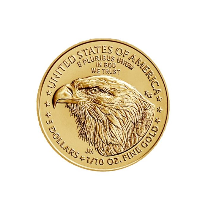 All American Eagle gold coins are minted with .9167 fine gold content (22-karat gold), which means silver and copper were added to the alloy in order to create a more wear-resistant coin. Nonetheless, the US Mint guarantees these coins contain the amount of pure gold stated on their reverse. That means the silver and copper are added on top of the 1/10 troy ounce pure gold content. This issue weighs, precisely, 0.1091 troy ounces (or 3.393 grams).