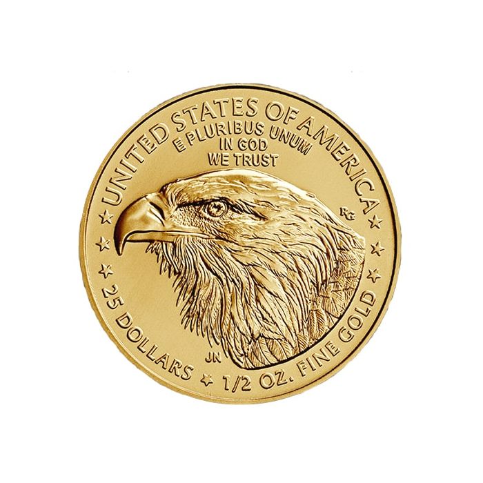 The new reverse design, announced in October of 2020, was created by Jennie Norris. The artist stated that she wanted to encapsulate all “pride and wisdom passed down through generations” of bald eagles, as she represented America’s national bird symbol gazing ahead. The mottos “E PLURIBUS UNUM” and “IN GOD WE TRUST” have been relocated to the top of the design, above the eagle’s head. The top still reads “UNITED STATES OF AMERICA'', but the order of the words on the bottom have been inverted, now saying “25 DOLLARS ½ OZ FINE GOLD”. Also, the words on the outer rim are now separated by 5-pointed stars.