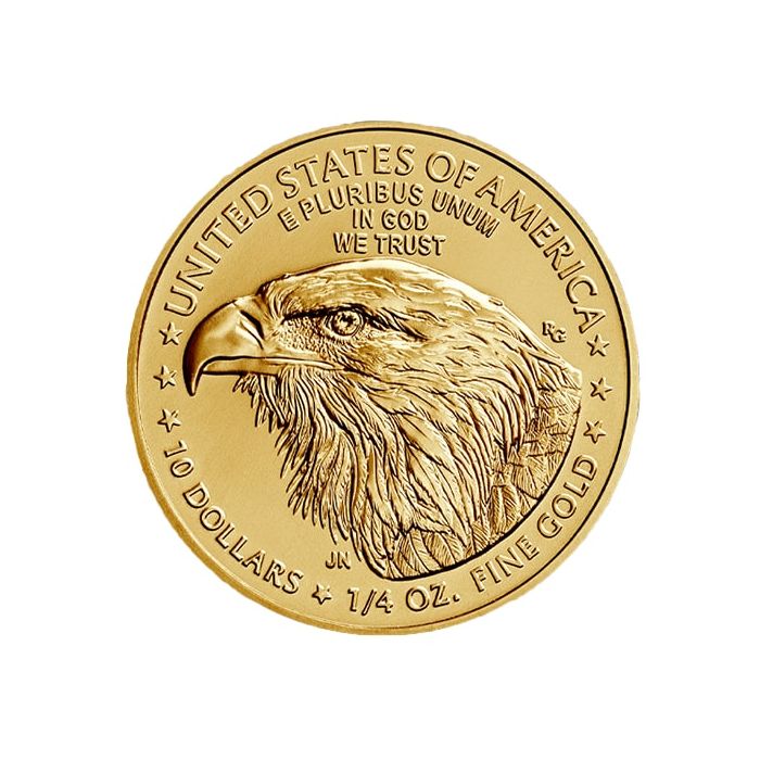 America’s mottos “E PLURIBUS UNUM” and “IN GOD WE TRUST” are engraved on the sides of the illustration and the country’s name on top. Below the eagle family is the gold content and face value of the coin, “1/4 OZ. FINE GOLD ~ 10 DOLLARS”.