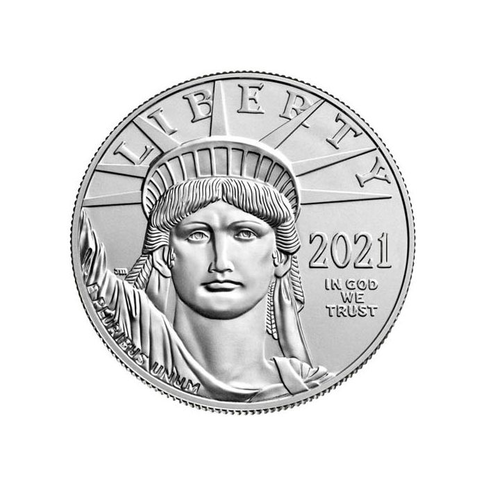 The obverse of these platinum coins features a close-up depiction of the Statue of Liberty with the word “LIBERTY” minted above her head. The words “E PLURIBUS UNUM” is minted on her robe in the bottom left, along with “2021” & “IN GOD WE TRUST” minted to her right