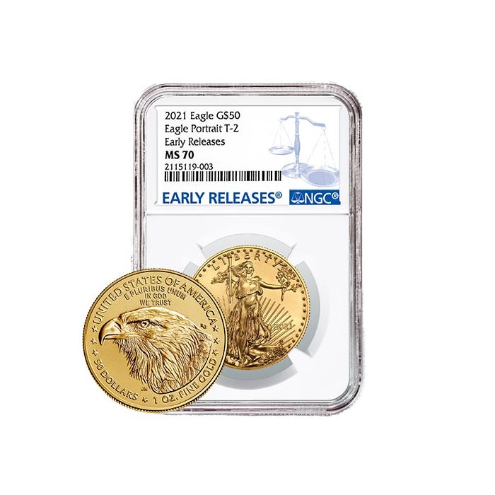 The 2021 MS-70 Early Releases Gold Eagle is graded by the Numismatic Guaranty Corporation (NGC), one of the world's largest grading firms, which certifies these coins as completely perfect, granting them their MS-70 rating. 'Early Releases' signifies that NGC obtained the coins within the first 30 days of the release date of the 2021 gold eagle coin. For an indication of just how rare an MS-70 rating is, only 6,334 of the 191,000 1 oz Gold Eagles minted in 2018 were certified as MS-70. This means that only 3.31% of all Gold Eagles minted in 2018 were considered to be flawless like these coins.