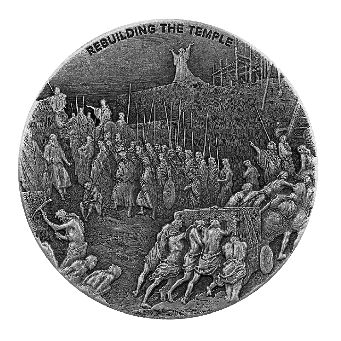 Like the previous Biblical coins in this series, each Certificate of Authenticity includes a Bible verse that contextualizes the image on the coin. The reverse depicts the scene that is described by the Bible verse. In this coin, Ezra is seen leading the reconstruction of the Temple after the Babylonians destroyed it. The scene was initially designed by Gustave Dore in the 1800s and is now seen on this coin.