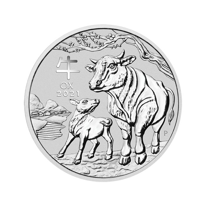 The new reverse of the coin features a stylized depiction of an ox with its calf. A village between mountains is portrayed in the background. Also used in the logo is a cherry blossom tree, the Chinese character for ‘ox’, the inscription ‘OX 2021’, and The Perth Mint’s ‘P’ mintmark.