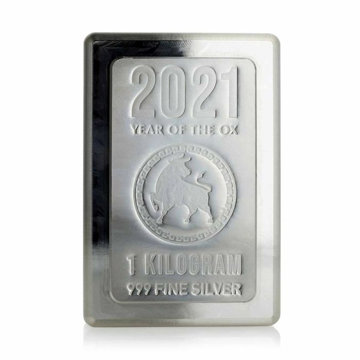 The obverse of these silver bars features an ox in the middle of the bar in a circle with "2021 YEAR OF THE OX" above it and "1 KILOGRAM 999 FINE SILVER" below the ox