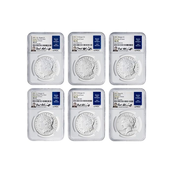 2021 NGC MS-70 First Day of Issue Morgan and Peace Dollar Silver 6-Coin Set - Joel Iskowitz Labels